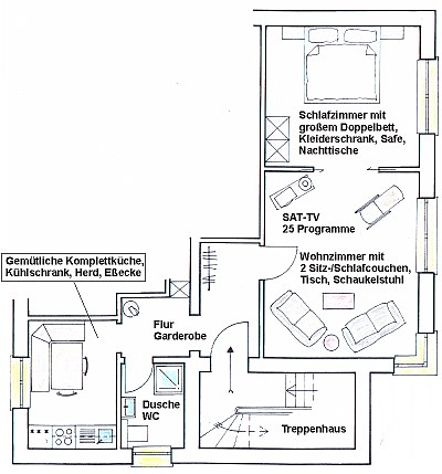 Ferienwohnung 1 für 2 - 4 Personen 60 qm, Teppichboden, Komplettküche mit Ess- & Kochgeschirr, Bettwäsche, Dusch- & Handtücher inklusive.