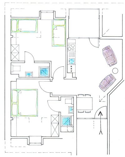 Wohn-/Esszimmer mit Esstisch und 4 Stühlen, Küchenzeile mit Kühlschrank, Gefrierschrank, Herd, Geschirrspüler, Spüle, Couch und Sessel mit Couchecke und SAT-TV. Ein Doppelschlafzimmer mit Kleiderschrank, Dusche/WC, ein Schlafzimmer mit 2 Einzelbetten, Kleiderschrank, Dusche/WC.